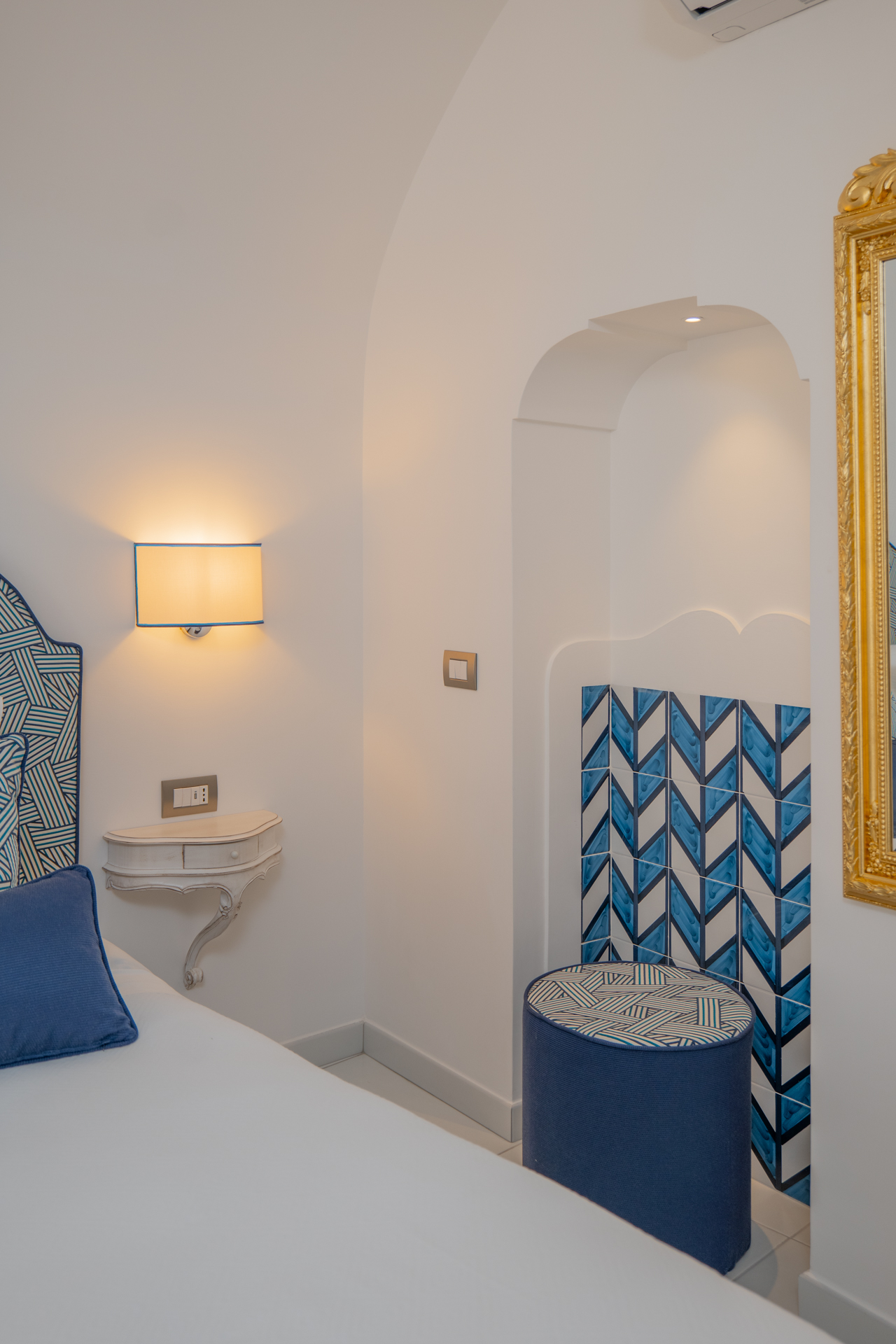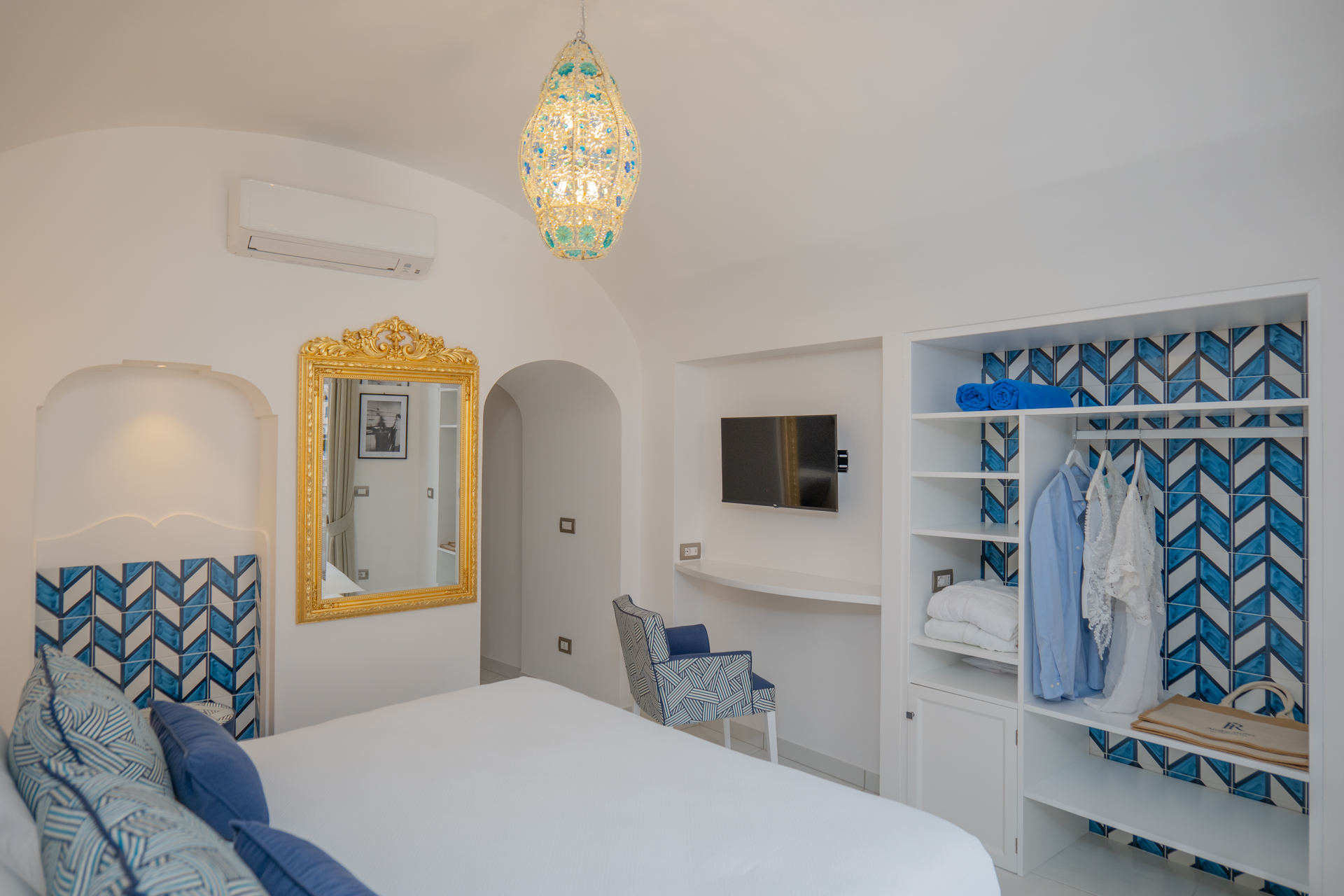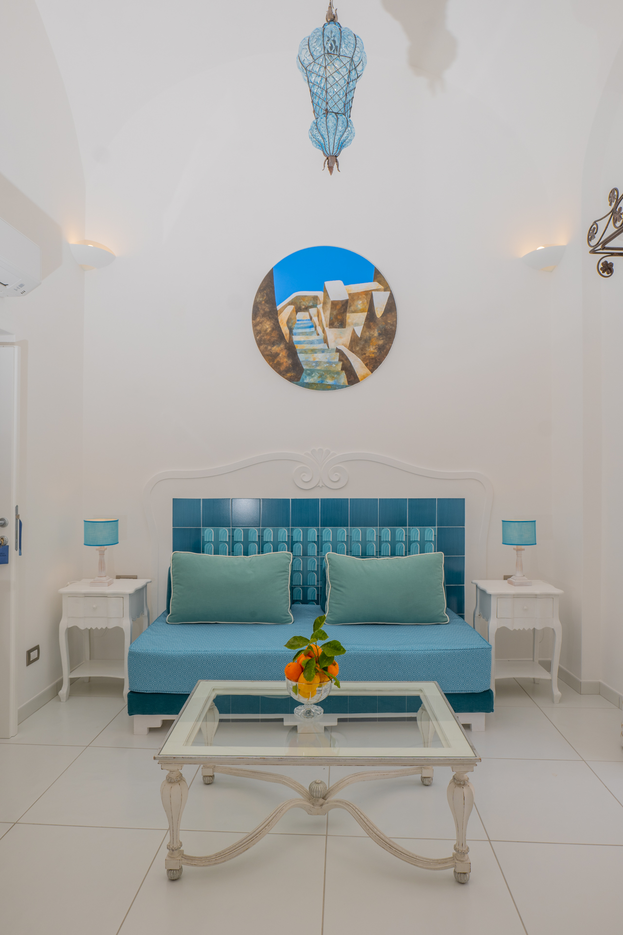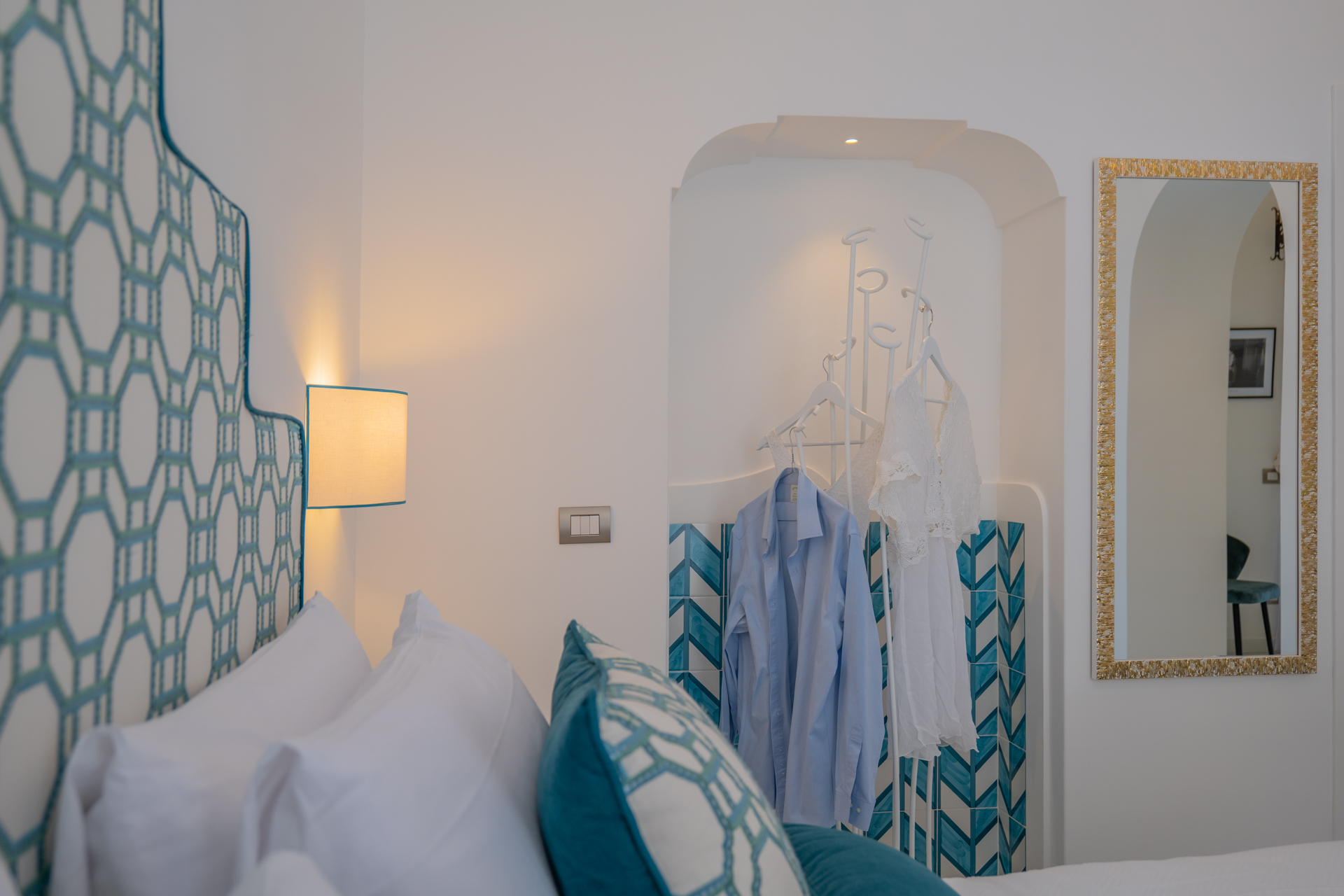 The room’s furnishings and decorations are a tribute to all the magnificent pastel colors of Positano. Starting with the curtains on the two balconies which frame the famous panorama of colorful little houses, to the typically coastal sculptures that enrich the room. The room Carla Vittoria also enjoys a spacious living room furnished with sofas, with a balcony with a view.
