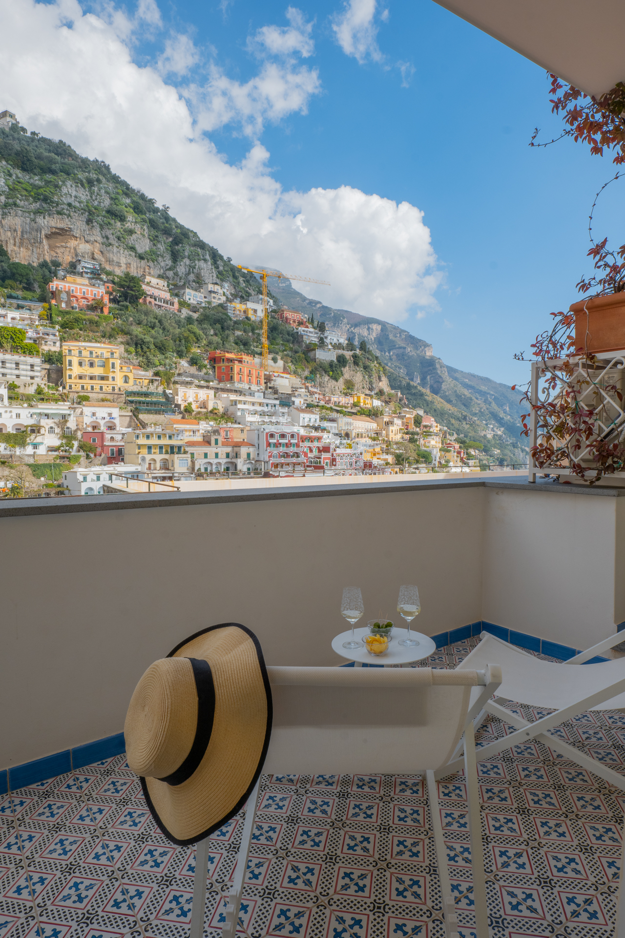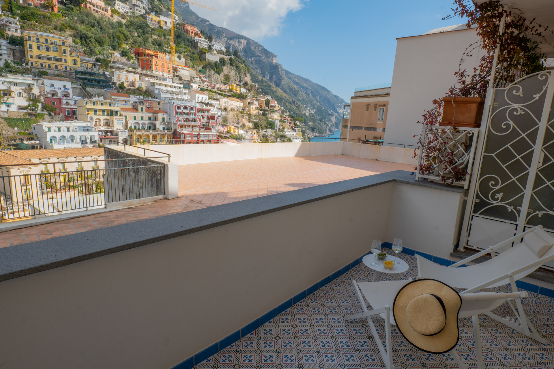 A balcony with a small terrace, equipped with a small table and two deck chairs, frames the celebrated Positan landscape.